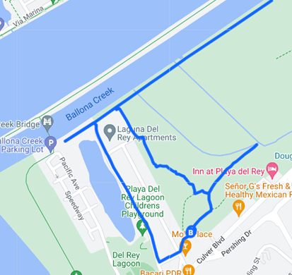 Visit the saltmarsh restoration areas through the main entrance gate at 303 Culver Blvd. Can walk through east to the outlook, then north through the marsh to the Ballona Creek. The out-and-back walk just within the Reserve would be around 0.5-1 mile. If we do the full walk in the map below that includes the Ballona Creek and looping around to see the Del Rey Lagoon, it would be around 2 miles.